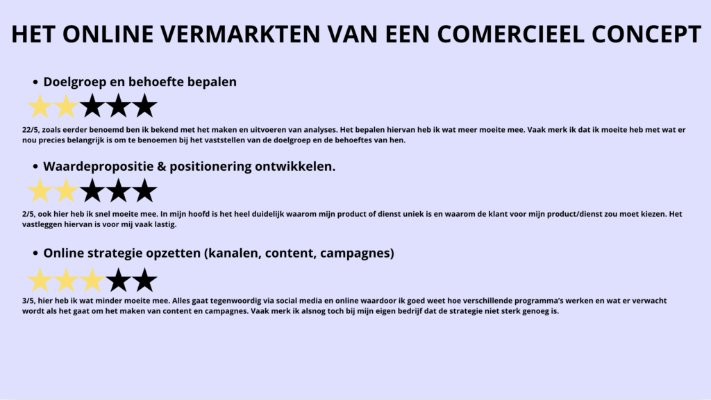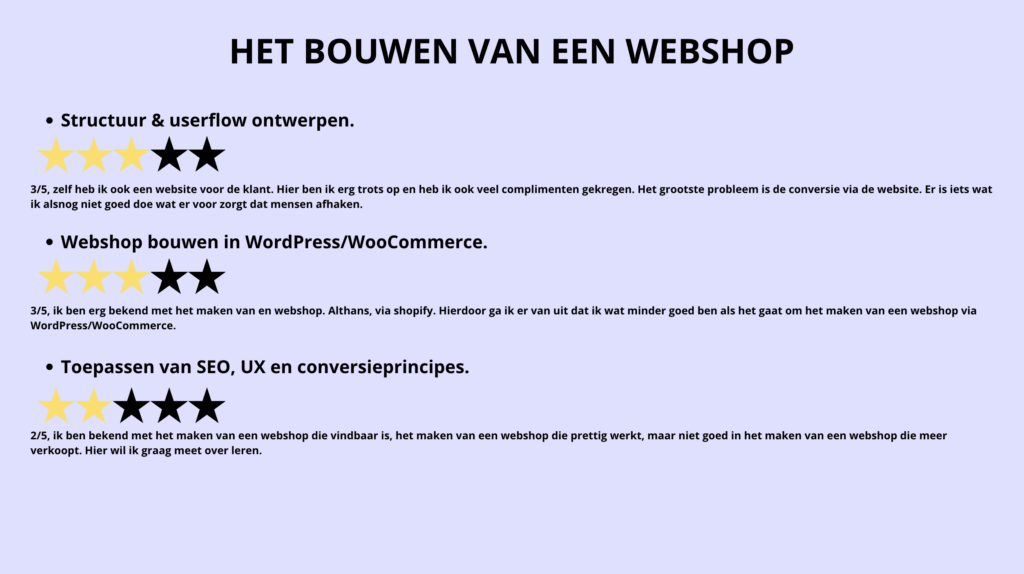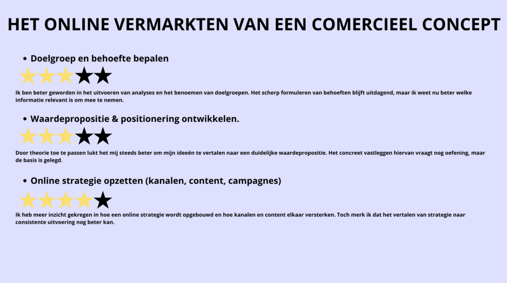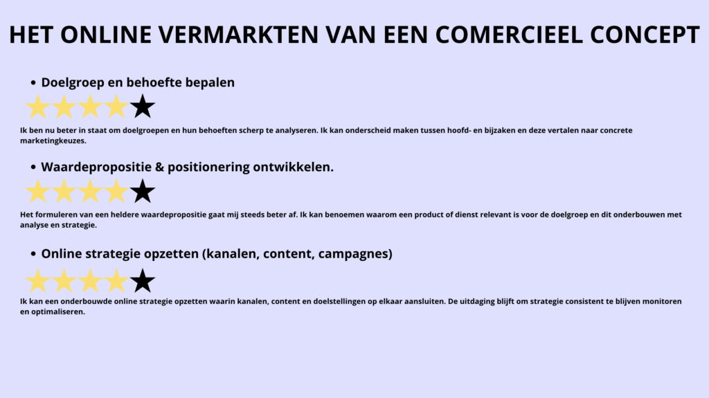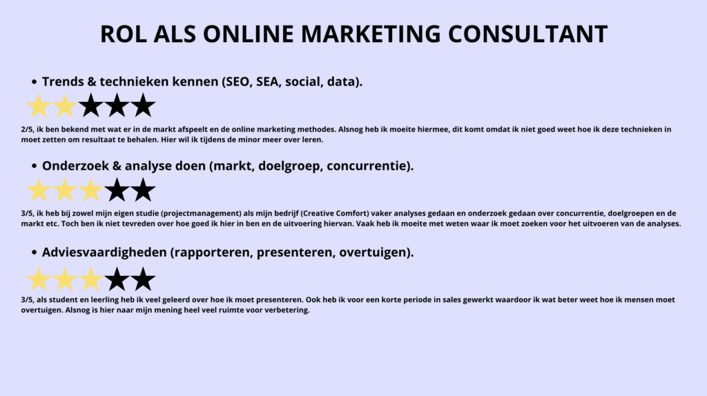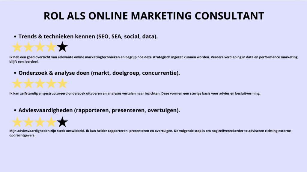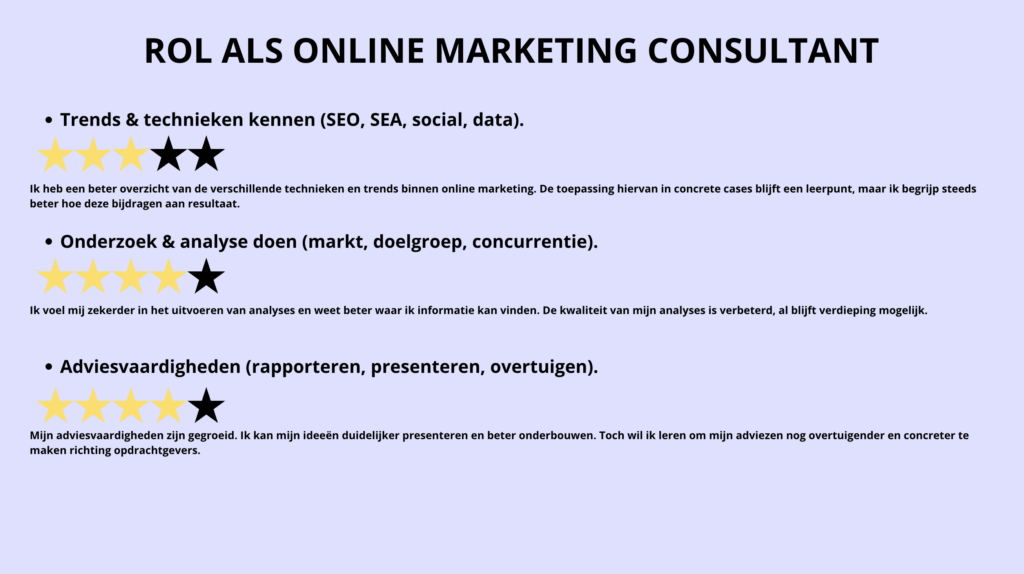 Tot slot wil ik groeien in mijn rol als online marketing consultant. Dit betekent zelfverzekerder adviseren, beter rapporteren en presenteren, en kritischer doorvragen bij opdrachtgevers om maximale waarde te leveren.