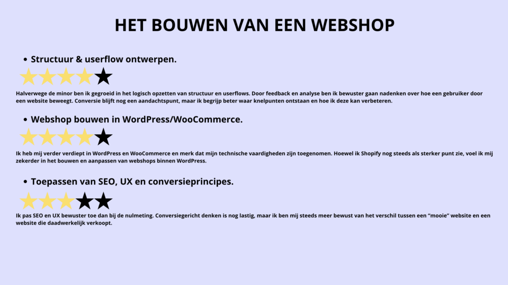 Ik wil mij verder ontwikkelen in het bouwen van websites en campagnes die niet alleen goed werken en er professioneel uitzien, maar ook daadwerkelijk conversie opleveren. Hierbij wil ik leren hoe ik gebruikersgedrag analyseer en optimalisaties onderbouw met data en testen.